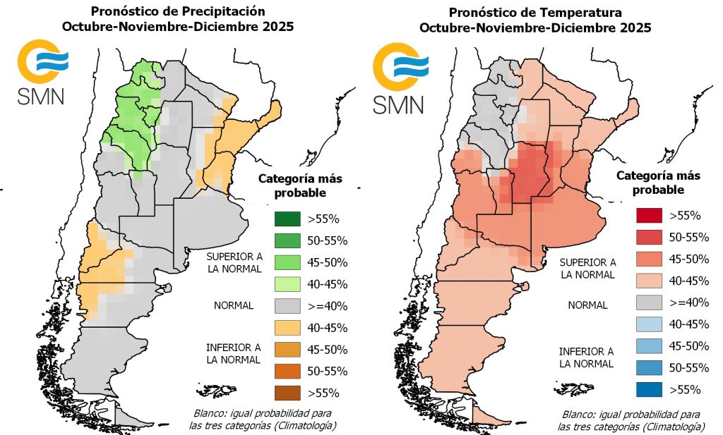 El contexto climático agrava el panorama: mientras que septiembre mostró lluvias localizadas en el sur y suroeste provincial, el pronóstico trimestral del SMN prevé precipitaciones dentro de lo normal, pero con temperaturas superiores al promedio, lo que podría intensificar el estrés si no mejora la oferta hídrica.